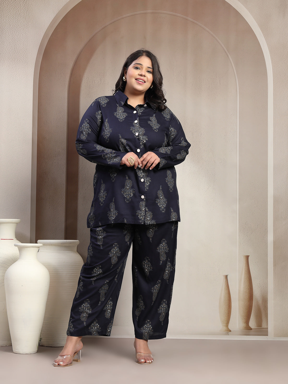 This co-ords consists of shirt and trouser Navy blue printed shirt, has shirt collar, Regular sleeves Navy blue printed trouser, has drawstring closure