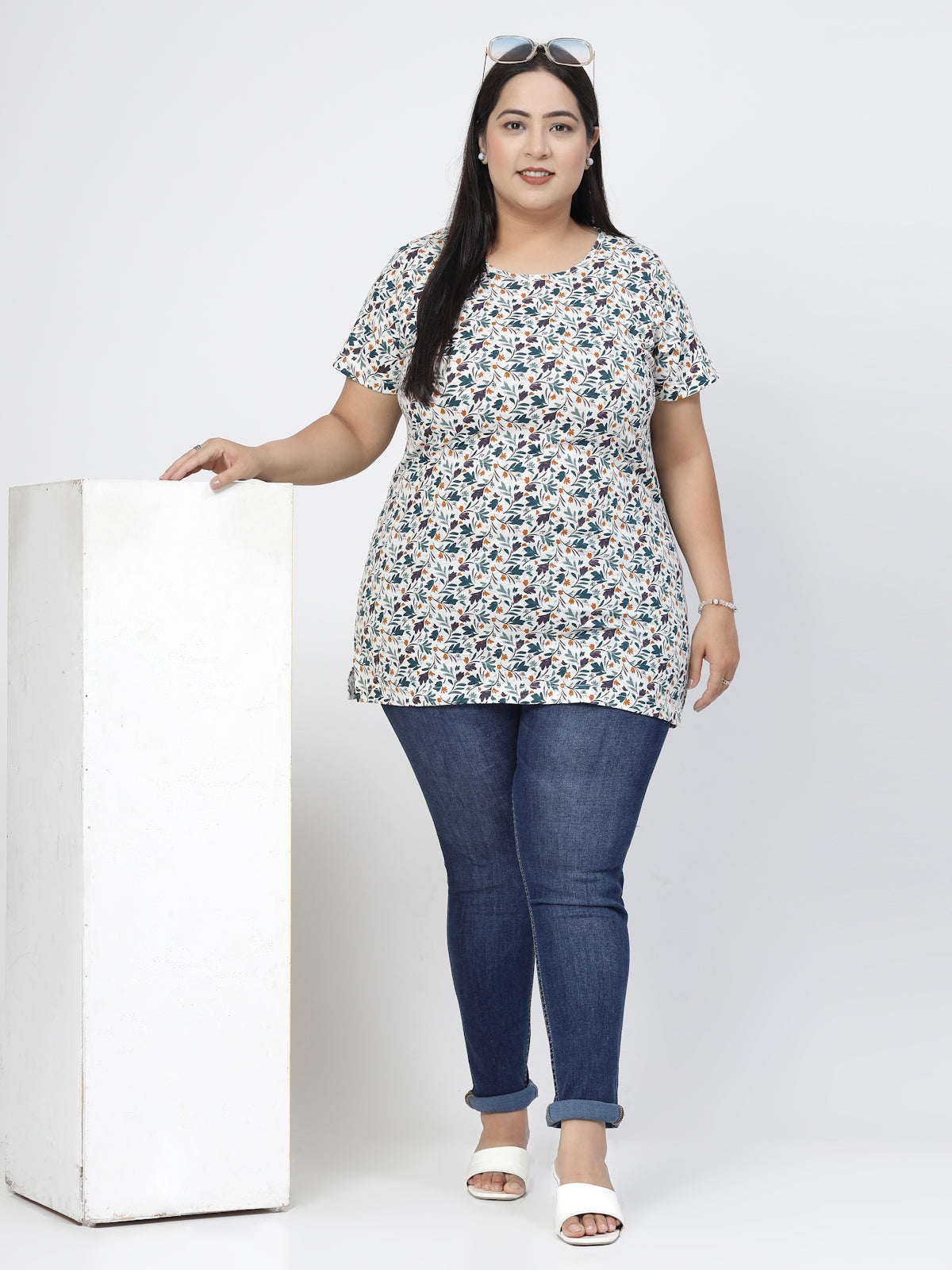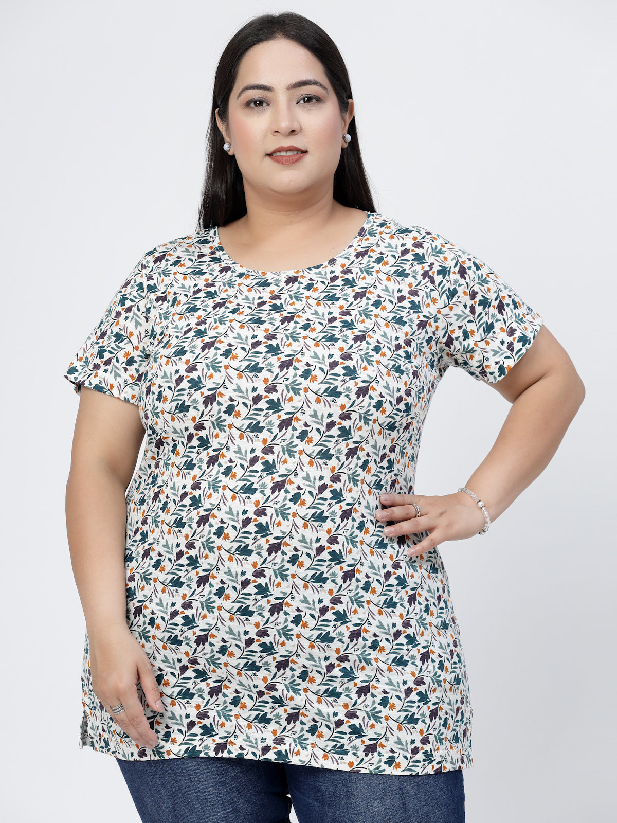 Plus Size White Floral Printed Round Neck Pure Cotton Casual T-shirt