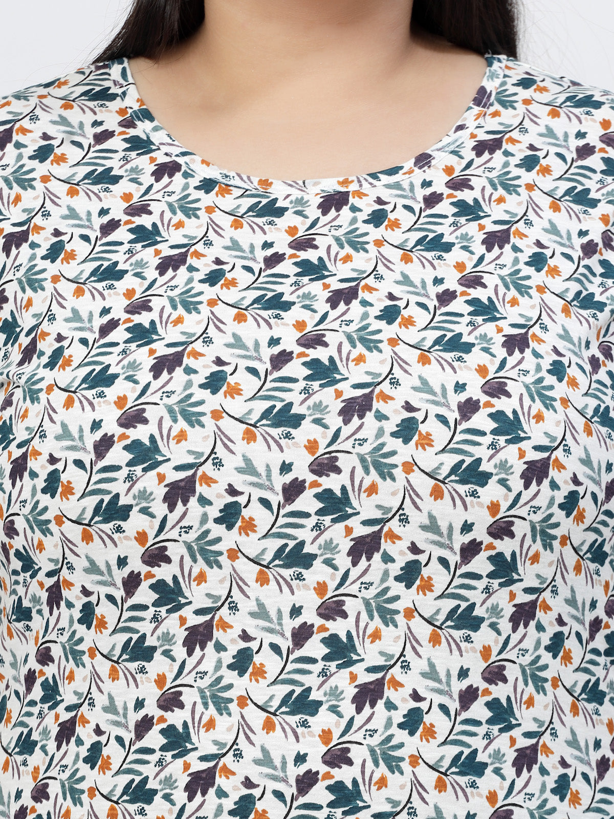 White Floral Printed Round Neck Pure Cotton Casual T-shirt