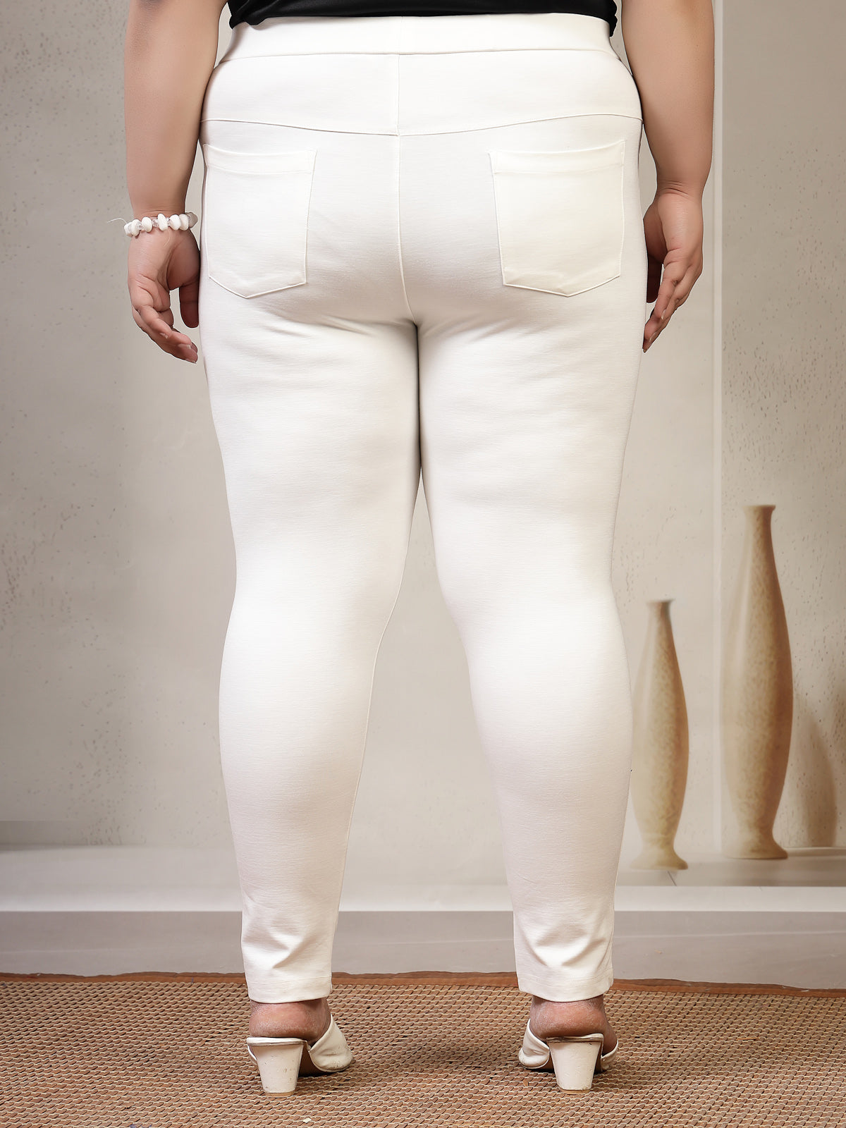 A pair of White jeggings, has four pockets, an elasticated waistband