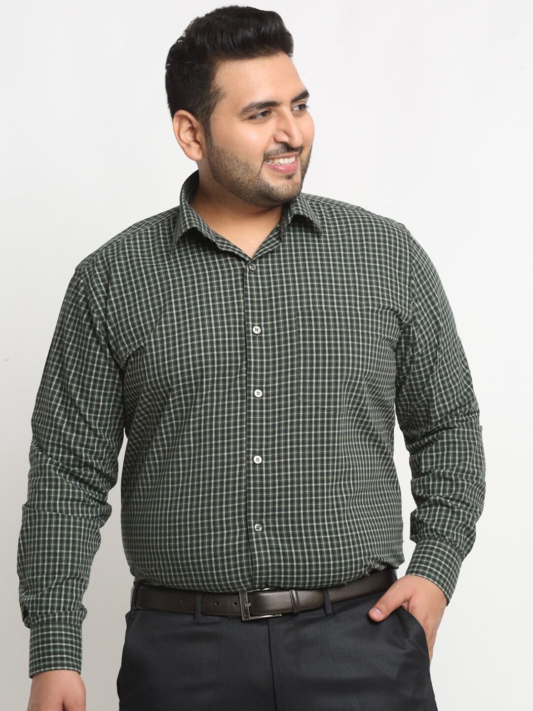 Plus Size Green Micro Checked Spread Collar Cotton Formal Shirt