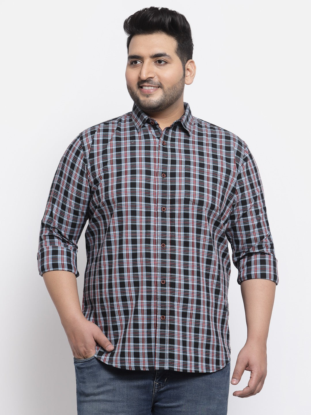 Plus Size Men Black Tartan Checked Cotton Casual Shirt