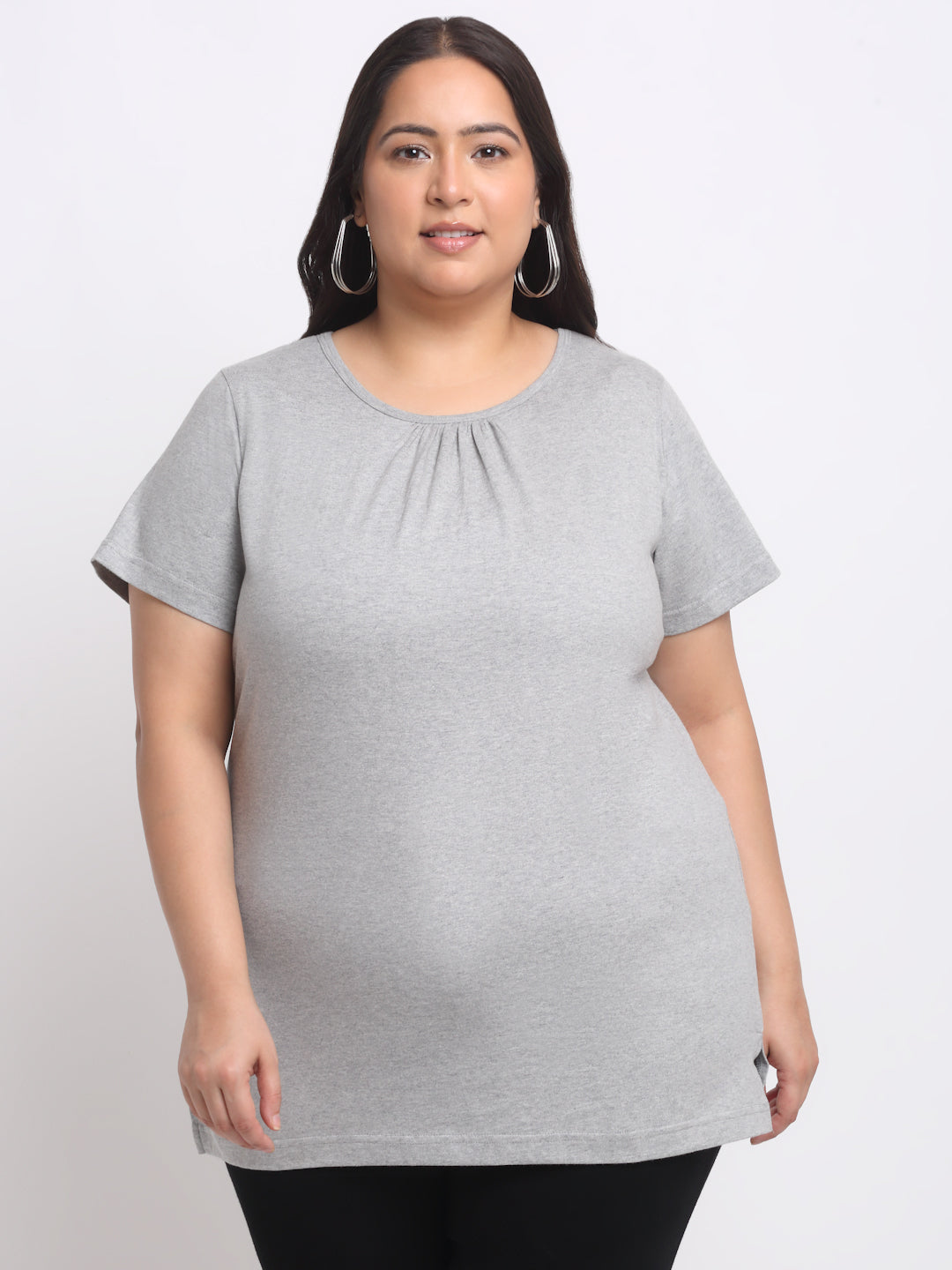 Plus Size Navy Blue Solid Round Neck Pure Cotton T-shirt