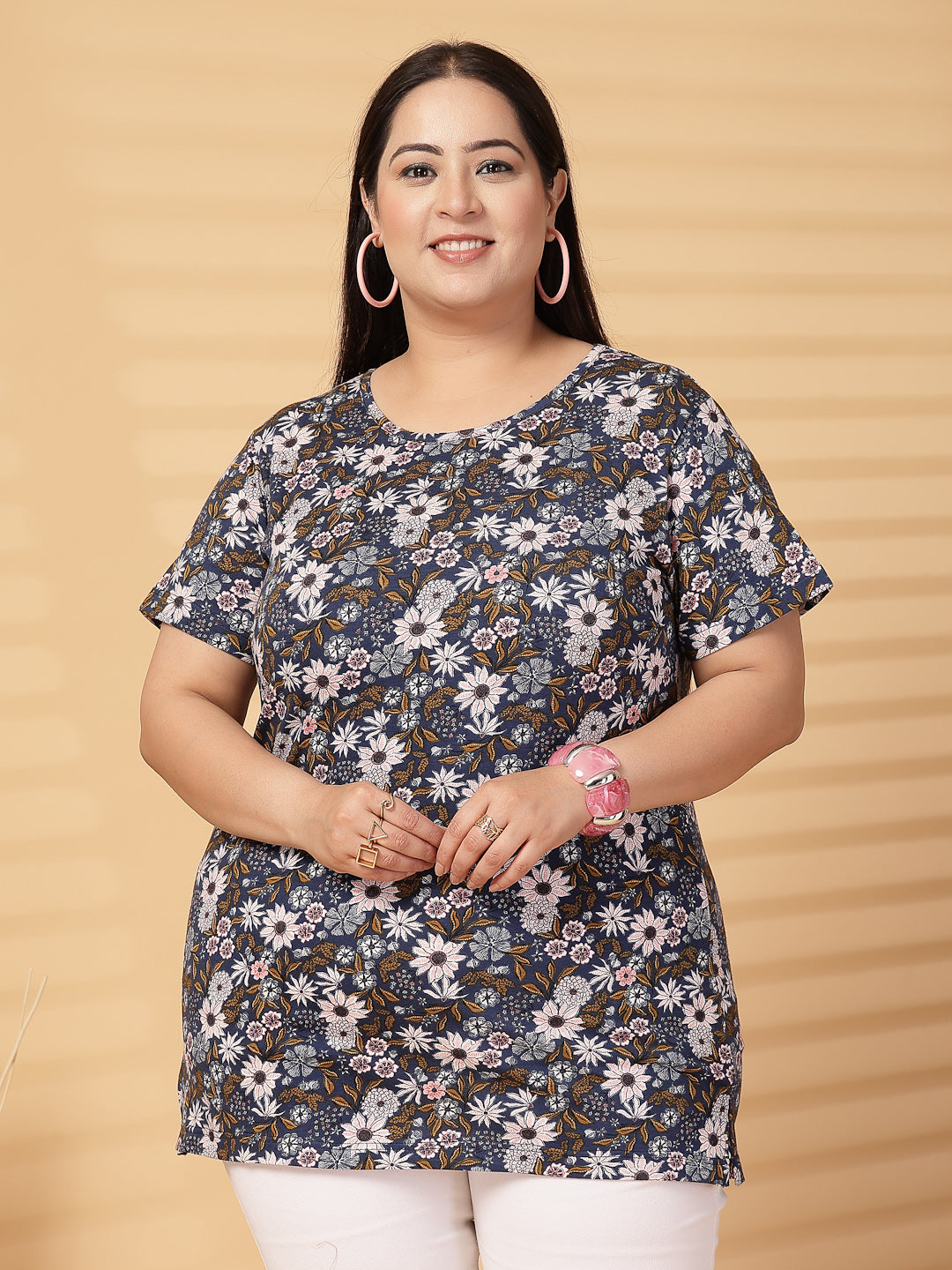 Plus Size Floral Printed Spread Collar Long Sleeves Cotton Casual Shirt