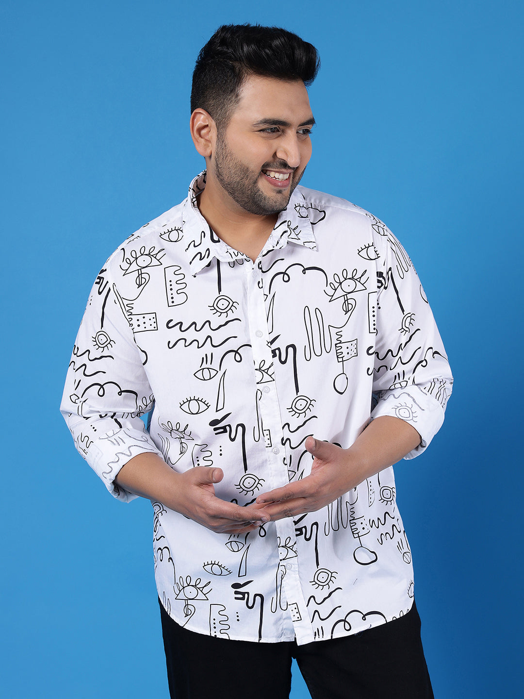 Our plus-size abstract design full-sleeve shirt features abstract prints in black throughout the garment.