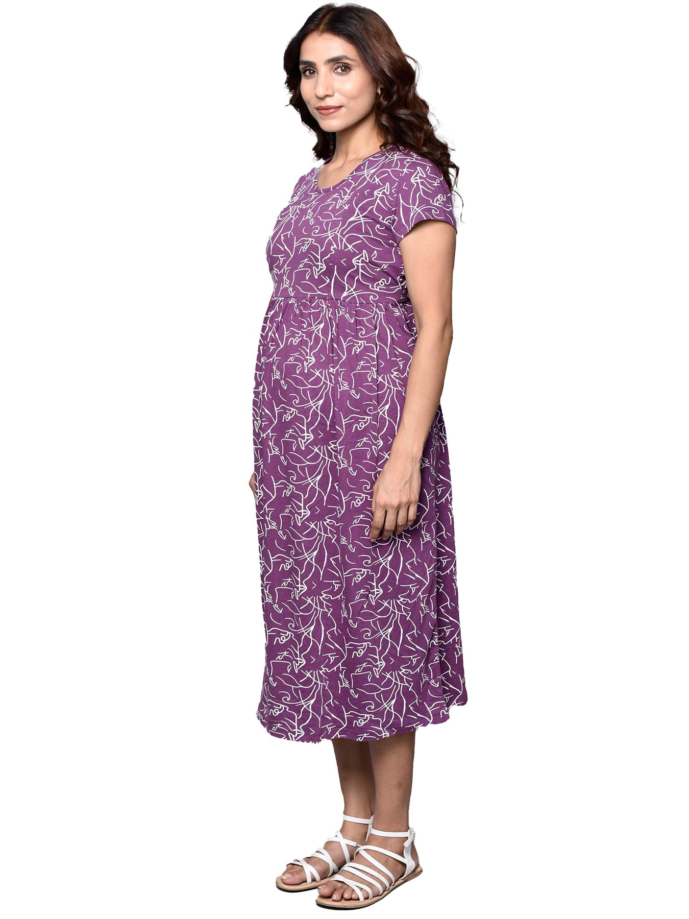 Organic Cotton Maxi Length Maternity Dress with short sleeves ISML017-Orchid Line Art